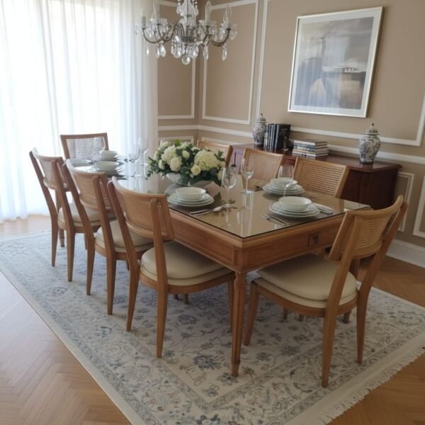 “Escape to the French Countryside, One Meal at a Time. Bring the warmth and charm of a French countryside retreat into your home with our Provence Dining Set. Picture this: a beautifully proportioned, glass-topped table, adorned with classic detailing, paired with elegant chairs boasting cane backs and inviting cushions. Create a setting that exudes relaxed sophistication, perfect for creating cherished moments with family and friends. Bonjour, delightful dining!”